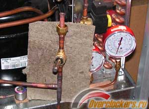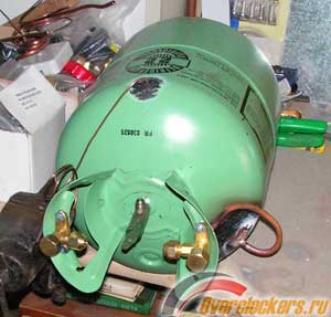 На емкости я поставил два заправочных вентиля от кондиционера. Сделано это для обеспечения возможности ремонтных работ без потери хладагента. Теперь можно закачать в емкость хладагент и потом, закрыв вентили, отсоединить емкость. Нужно добавить, что выходная трубка из расширительной емкости должна быть снизу. Масло все-таки попадает в расширительную емкость и скапливается на ее дне. А так оно по выходной трубке будет возвращаться в компрессор.