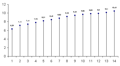 Напряжение варьируется между 6,29 до 10,43 вольт.