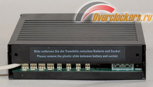 На задней панели обнаруживается по четыре разъёма для подключения термодиодов и вентиляторов, разъём питания в виде молекса для 5,25” устройств и выходящий наружу 45 сантиметровый шлейф, для подключения к “внутреннему” разъёму USB, разведённому на материнской плате. На корпусе устройства, над вышеописанными разъёмами расположена наклейка, которая на английском и немецком языках рекомендует пользователю удалить пластиковый ярлычок между батарейкой и сокетом, в котором она установлена. Если этого не сделать, то устройство будет сбрасывать пользовательские настройки и таймер часов после отключения питания. Для получения доступа к батарейке необходимо снять металлическую крышку с BayMaster.