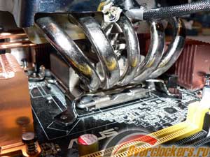 В основании кулер даже со стороны выхода из него трубок компактен, то есть помех высоким радиаторам на материнской плате не создаст: