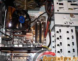 Тем не менее, такая ориентация кулера, на мой взгляд, вполне благоприятна как для отвода нагретого воздуха из корпуса системного блока, так и для охлаждения радиатора на силовых элементах схемы питания материнской платы.