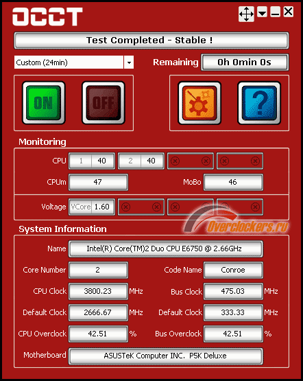 Все тесты были проведены в операционной системе Windows XP Professional Edition SP2. Для мониторинга температуры процессора использовалась утилита мониторинга SpeedFan версии 4.34 Beta 37, поддерживающая считывание показаний температуры непосредственно из регистров процессоров (Core Sensor's). Её показания совпадали с данными Core Temp версии 0.96. Система автоматической регулировки оборотов вентиляторов кулеров в BIOS материнской платы была выключена. Контроль срабатывания термозащиты процессоров (режима пропуска тактов – throttling) осуществлялся с помощью программы RightMark CPU Clock Utility версии 2.30. Разогрев CPU был выполнен с помощью программы OCCT (OverClock Checking Tool) версии 1.1.1b в режиме максимальной нагрузки на процессор при 24-минутном периоде тестирования из которого первая и последние 4 минуты являются временем простоя системы.