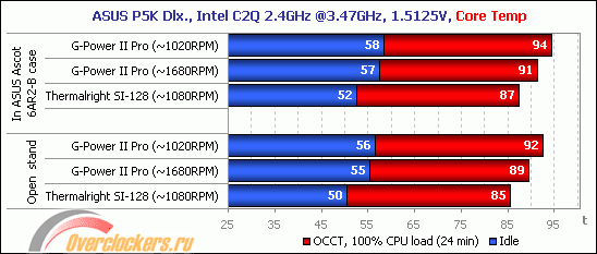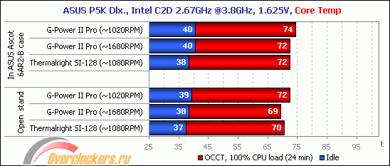 Эффективность систем охлаждения проверялась не менее чем двумя циклами тестирования с периодом стабилизации температуры в корпусе системного блока равным ~20 минутам. На открытом стенде, когда материнская плата находится горизонтально, а кулеры на ней в вертикальном положении, период стабилизации был практически вдвое меньше. За итоговый результат принимались максимальные показатели температуры самого горячего из двух/четырёх ядер процессоров по двум циклам тестирования (при условии если разница между данными не превышала одного градуса, в противном случае тестирование проводилось ещё один раз, как минимум). Несмотря на период стабилизации температуры, как правило, результаты второго цикла прогрева были выше на 0.5-1 градус Цельсия.