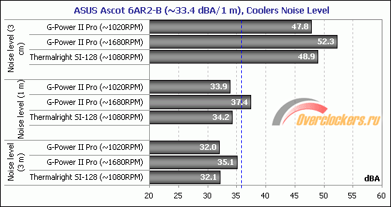 Измерение уровня шума систем охлаждения проводилось электронным шумомером CENTER-321 по уже хорошо знакомой постоянным посетителям сайта методике. Субъективно комфортный уровень шума в ~36 дБА отмечен на диаграмме штриховой полосой, а фоновый уровень шума системного блока без процессорного кулера, измеренный с расстояния в 1 метр, не превышал 33.4 дБА.