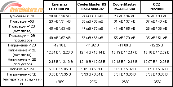 В этом разделе пока никаких изменений с предыдущими обзорами блоков питания нет. Измерения пульсаций блоков питания производились с помощью четырехканального осциллографа Tektronix 2246-1Y с максимальной полосой пропускания сигнала 100 МГц, чего со значительном запасом достаточно для выявления всех возможных помех. При превышении основных силовых напряжений (+3.3, +5 и +12) исправно выключались, предотвращая возможность повреждений. Блоки Enermax Galaxy DXX и OCZ ProXStream четко отключались при возникновении коротких замыканий на всех основных линиях, при этом Enermax сигнализировал двумя короткими звуковыми сигналами. Блок CoolerMaster отключался при КЗ на линии +5 и +3.3В, однако при замыкании +12В легко достигал величины более 35А. Для приближения результатов тестирования к реальным условиям использования в ПК был использован системный блок следующей конфигурации: