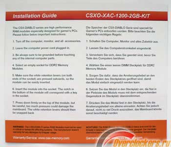 В помощь новичкам, на картонном вкладыше внутри упаковки на английском и немецком языках подробно описан процесс установки памяти в слоты на материнской плате: