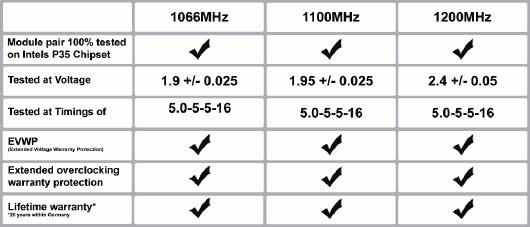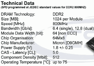 Правда интересного в ней мало. Вполне стандартная схема частот и таймингов для памяти стандарта PC2-6400 (800 МГц), хотя по номинальной частоте CSXO-CEC-1066-2GB-KIT вполне тянет на официально несуществующий PC2-8500 (1066 МГц). Номинальное напряжение модулей составляет 1.9 В.