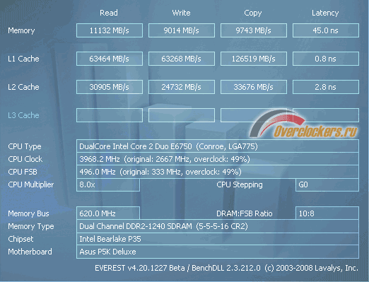 Приступаем к изучению разгона новой памяти. Прежде всего CSX DIABLO была проверена на напряжении в 2.0 В с таймингами 4-4-4-12. С такими настройками модули взяли частоту в 900 МГц, а при повышении напряжения до 2.2 В стабильно функционировали на 970 МГц эффективной частоты. При увеличении напряжения ещё на 0.2 В и конечных 2.4 В память удалось разогнать до 1015 МГц, что для таймингов 4-4-4-12 является отличным результатом. В то же время на стандартных для DIABLO таймингах 5-5-5-16 и при напряжении в 2.0 В модули функционировали на частоте в 1114 МГц. Постепенно повышая напряжение до 2.2 В (с шагом в 0.05 В) без потери в стабильности частоту удалось повысить до 1180 МГц. Ну а итоговый результат был зафиксирован на отметке в 1240 МГц при напряжении в 2.4 В. Скорость работы памяти по тестам Everest очень даже впечатляет: