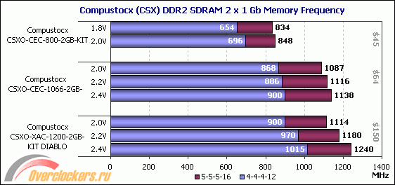 Однако и здесь нам подтвердили, что в CSXO-CEC-1066-2GB-KIT используются микросхемы производства Powerchip, поэтому с учётом результатов разгона, полученных на CSXO-CEC-800-2GB-KIT, чего-либо выдающегося ждать здесь не приходилось. И, как оказалось, не зря.