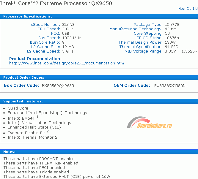 Инженерный семпл (ES) процессора Intel Core 2 Extreme QX9650 имеет разблокированный множитель, маркировку "Q7UE ES Malay" и номинальное напряжение в 1.25 В. На сайте Intel существует только один процессор Intel Core 2 Extreme QX9650 и относится он к степпингу C0:
