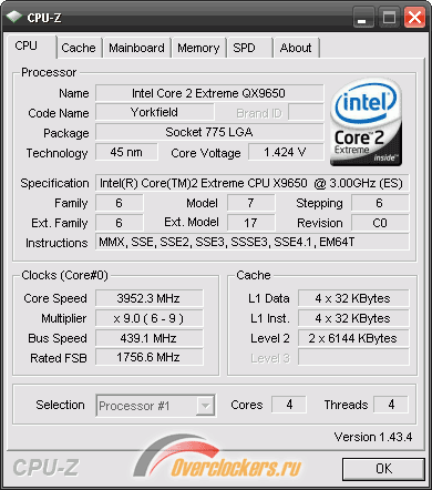 - Процессор: Intel Core 2 Extreme QX9650, 3.0 ГГц, 1.25 В, L2 2 x 6 Мб, FSB: 333 МГц x 4, (Yorkfield, C0);