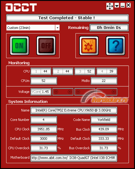 Разогрев CPU был выполнен с помощью программы OCCT (OverClock Checking Tool) версии 1.1.1b в режиме максимальной нагрузки на процессор при 23-минутном периоде тестирования из которого первая и последние 4 минуты являются временем простоя системы: