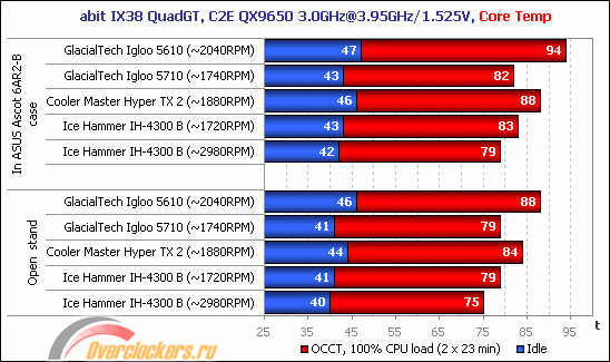 Эффективность систем охлаждения проверялась не менее чем двумя циклами тестирования с периодом стабилизации температуры в корпусе системного блока равным ~20 минутам. На открытом стенде период стабилизации был практически вдвое меньше. За итоговый результат принимались максимальные показатели температуры самого горячего из четырёх ядер процессора по двум циклам тестирования (при условии если разница между данными не превышала одного градуса, в противном случае тестирование проводилось ещё один раз, как минимум). Несмотря на период стабилизации температуры, как правило, результаты второго цикла прогрева были выше на 0.5-1 градус Цельсия.