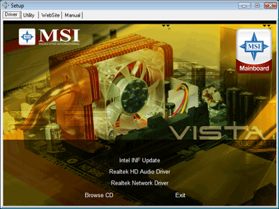 В комплект к материнской плате MSI P35 Platinum Combo входят два CD-диска с драйверами и утилитами для Windows XP и Windows Vista. При старте любого из них, прежде всего нам предлагается установить комплект драйверов.