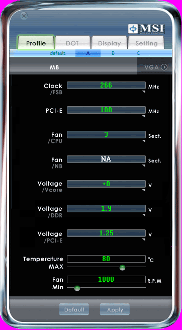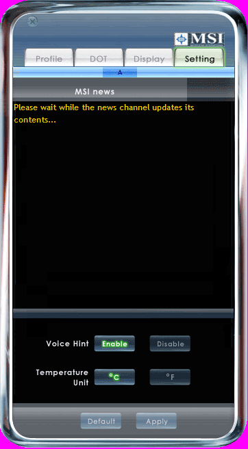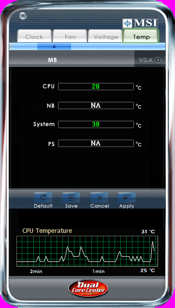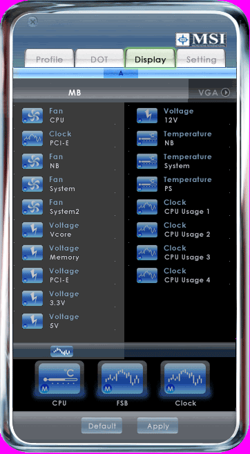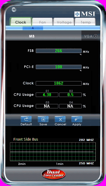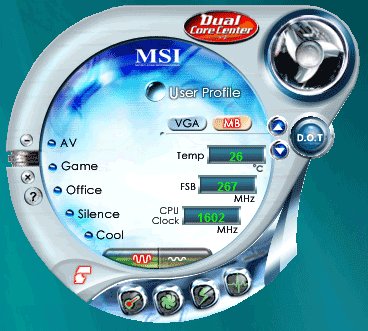 Вероятно, вам известно, что в Windows Vista имеется боковая панель, для которой есть несколько программ от Microsoft и множество утилит от сторонних разработчиков. Подобной программой является MSI Dual Core Center sidebar. Смотрится окно утилиты очень скромно.