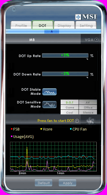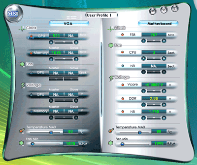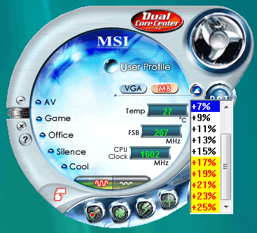 По-умолчанию нам демонстрируется температура процессора, частота FSB и итоговая частота CPU. Нажатие на кнопку VGA позволит узнать температуру и частоты видеокарты. Имеется пять предустановленных профилей настроек для различных режимов работы: AV, Game, Office, Silence и Cool. Значки в виде червячков (~) управляют скоростью реакции системы на появление или исчезновение нагрузки. Нажатие на кнопку User Profile выводит окно, где пользователь может выбрать один из трёх дополнительных пользовательских профилей.