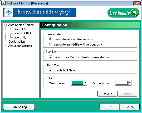 Есть возможность включить или отключить автостарт программы со стартом Windows, показ новостей от MSI, можно даже зачем-то выбрать цветовое оформление по вкусу, однако не нашлось возможности для обновления BIOS, используя имеющийся на диске образ. Для тестового стенда, который не подключен к сети, такая возможность лишней явно не была бы, поскольку встроенной в BIOS материнской платы утилиты для обновления у MSI нет.
