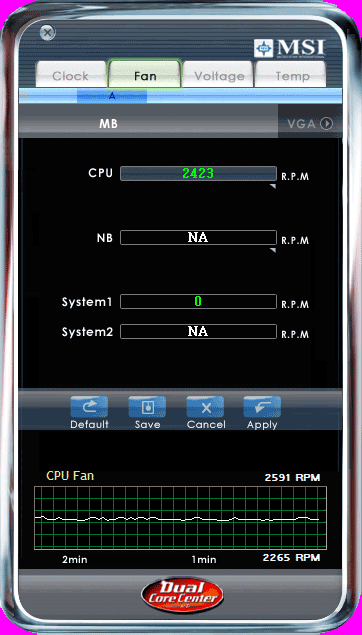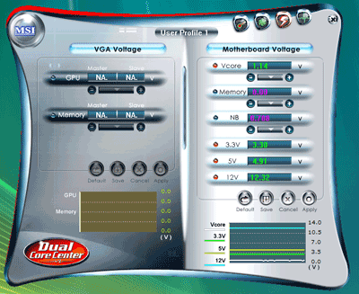 К сожалению, разработчикам ещё немало придётся поработать над функциональностью и безопасностью программы MSI Dual Core Center sidebar. При старте процессора Intel Core 2 Duo E8400 в штатном режиме утилита почему-то опустила частоту FSB с 333 до 320 МГц. Оказалось, что это ещё вполне безобидная шутка. После загрузки системы с процессором, разогнанным с повышением напряжения, с ужасом было обнаружено, что оно увеличено свыше 1.8 В! К счастью, процессор с номинальным напряжением 1.225 В из строя не вышел, а программа была немедленно удалена. К тому же она тоже так и не смогла регулировать скорость вращения трёхконтактного процессорного вентилятора.