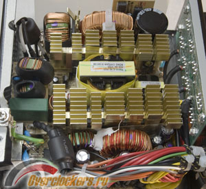 Внутреннее устройство с довольно плотной компоновкой компонентов вмещает плату блока и плату с модульными разъемами для кабелей. Радиаторы из алюминия имеют довольно развитое оребрение. Высоковольтная цепь имеет в своем составе APFC и один накопительный конденсатор емкостью 330мкФ, с номинальным напряжением 400В.