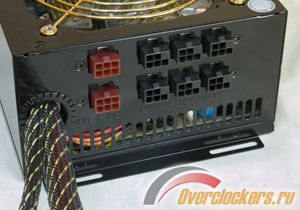Для подключения видеокарт предназначены темно-красные разъемы, которые немного отдалены от остальной группы периферийных разъемов. Кроме того, сами разъемы имеют ключ, поэтому подключить кабель для питания видеокарты в периферийный разъем не удастся, но наоборот – вполне. Поэтому следует проявлять бдительность при подключении кабелей, чтобы не спутать черный с красным. Кабели в месте выхода из блока питания защищены от перетирания пластиковым кольцом.