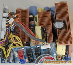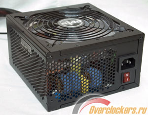 Корпус блока усеян отверстиями перфорации, что облегчает вентиляцию радиаторов. Задняя сторона блока имеет 6 разъемов для кабелей питания, 4 разъема для термодатчиков и 1 для кулеров. Силовые разъемы типа MiniFit-JR, предназначенные для питания видеокарты, окрашены в синий и красный цвета, а для периферии – черные. Чтобы предотвратить неверное подключение, разъемы различаются по ключам.