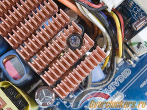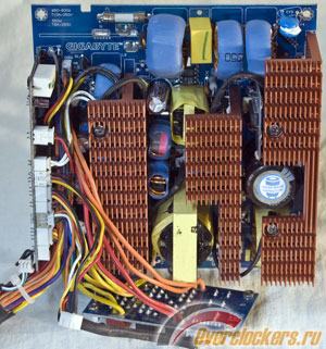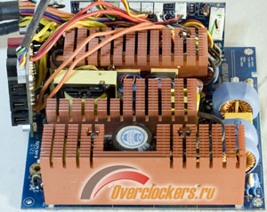 Несмотря на медный цвет – радиаторы блока алюминиевые, с неплохо развитым оребрением. Разглядеть маркировки примененных силовых элементов не представляется возможным без демонтажа радиаторов, а поскольку необходимо было сохранить гарантийное состояние блока – этого делать не стали.