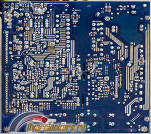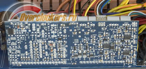 На плате с двухсторонней разводкой дорожек все детали смонтированы плотно. На плате со стороны пайки в некоторых местах заметны следы флюса, но в целом все выполнено качественно. Немного необычно установлена подсветка в блоке, прямо на радиаторах. Таким образом, блок светит четырьмя синими светодиодами прямо перед собой, что лучше помогает освещать компьютерную начинку.