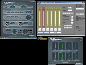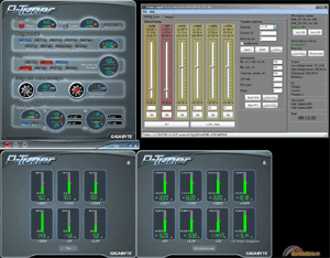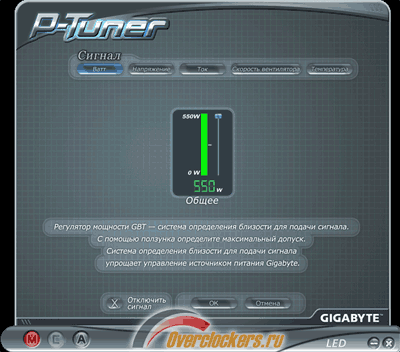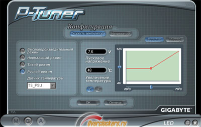 Впервые пришлось устанавливать драйвер для коврика блока питания. Устанавливаем с CD программу для контроля и управления Gigabyte P-tuner. Инсталляция под управлением Windows XP и Windows 2003 не вызвала никаких проблем, как на тестовом ПК, так и на ноутбуке. После установки нам открывается красочный интерфейс, где можно сразу увидеть большинство основных электрических характеристик, таких как напряжения по всем каналам, токи нагрузки, температура внутри блока питания и внешних датчиков, а также скорость вращения вентилятора.