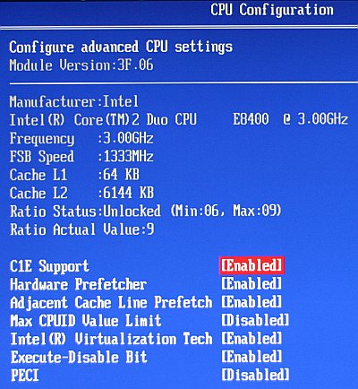 А я ещё имел наглость ругать материнские платы Asus за то, что при изменении напряжения на процессоре они отключают EIST. Материнская плата Foxconn X38A намного "круче", она сразу же, при малейшей попытке разгона, лишает нас возможности уменьшать коэффициент умножения и напряжение на процессоре при отсутствии нагрузки. Просто ужасное и ничем не оправданное поведение.