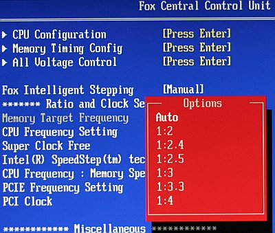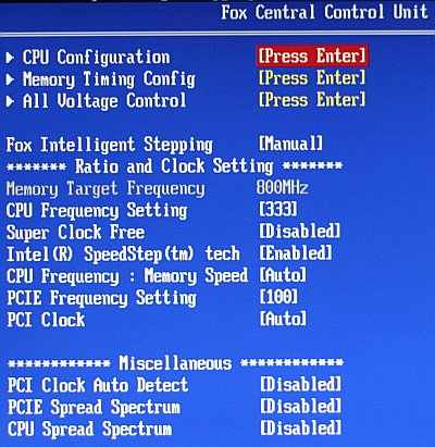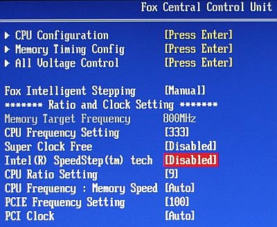 Из-за сложности и запутанности BIOS материнской платы Foxconn X38A поначалу даже не возник вопрос, почему это параметр Intel SpeedStep tech, управляющий включением или отключением технологии EIST, был вынесен в главное меню раздела Fox Central Control Unit из подраздела CPU Configuration, где он обычно находится. Оказалось, что сделано это неспроста, при первой же попытке разгона, даже при изменении частоты FSB всего на 1 МГц, технология EIST автоматически отключается.