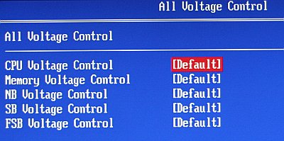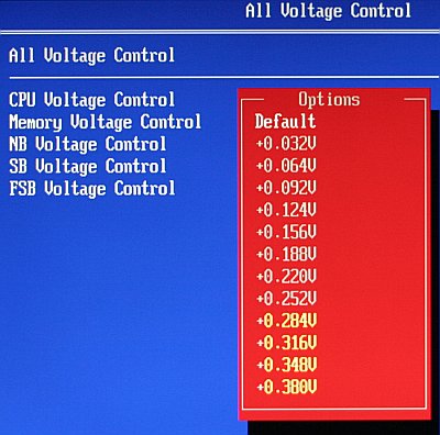 Интервал изменения напряжения на процессоре позволяет поднять его вплоть до +0.3875 В с шагом 0.0125В. Для остальных напряжений шаг изменения переменный, а максимальные значения следующие: память +1.491 В, северный мост +0.38 В, южный мост +0.424 В, на шине FSB +0.56 В. Нужное значение выбирается из ниспадающего меню, опасно высокие цифры подсвечиваются жёлтым цветом.