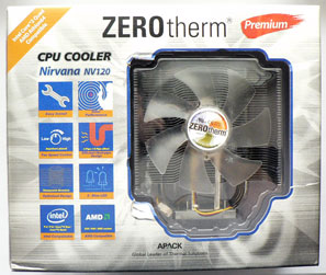Ну и, наконец, флагман линейки кулеров APACK ZEROtherm – Nirvana NV120 Premium – поставляется также в серебристой коробке, правда оформленной уже несколько по-иному: