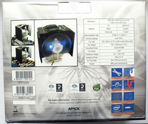 На лицевой стороне, помимо наименования модели кулера, в оригинальных пиктограммах отмечены его ключевые особенности. На оборотной стороне упаковки приведён уже традиционный для продуктов ZEROtherm перечень технических характеристик и несколько фото кулера.