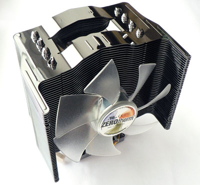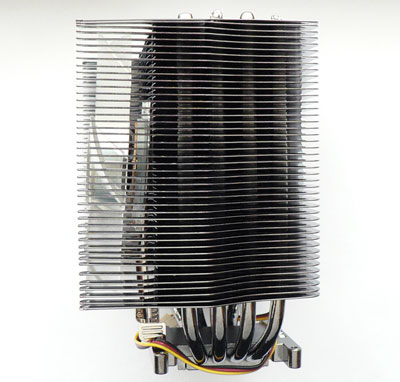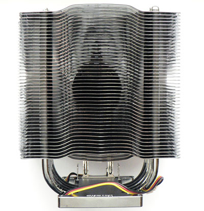 Массивный радиатор Nirvana NV120 Premium набран из 44 алюминиевых рёбер толщиной около 0.3 мм, покрытых тёмно-серой глянцевой краской и нанизанных на четыре медных тепловых трубки диаметром 6 мм. Охлаждает всю эту массивную конструкцию размерами 128 x 95 x 150 мм крыльчатка от вентилятора типоразмера 120 х 25 мм:
