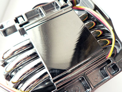 При этом обратите внимание, что тепловые трубки, выходя из основания, немного разведены в стороны, что позволяет более равномерно распределять тепловой поток по алюминиевым рёбрам радиатора.