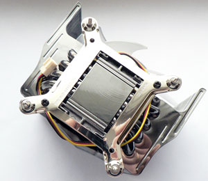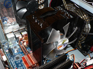 Оба типа крепления надежно прижимают все 638 грамм “Нирваны” к теплораспределителям процессоров. В случае установки кулера на материнские платы с разъёмом LGA 775 неудобно приворачивать пару винтов со стороны вентилятора. Понадобится длинная отвёртка, так как лопасти вентилятора находятся непосредственно над винтами, а как его (вентилятор) снять я не догадался :).