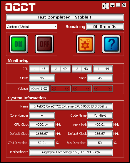 Её показания совпадали с данными Core Temp версии 0.96.1. Технологии автоматической регулировки оборотов вентиляторов кулеров в BIOS материнской платы были выключены (за исключением кулеров с поддержкой PWM). Контроль срабатывания термозащиты процессоров Throttling (режима пропуска тактов) осуществлялся с помощью утилиты RightMark CPU Clock Utility 2.35.0, теперь поддерживающей процессор Intel Core 2 Extreme QX9650.