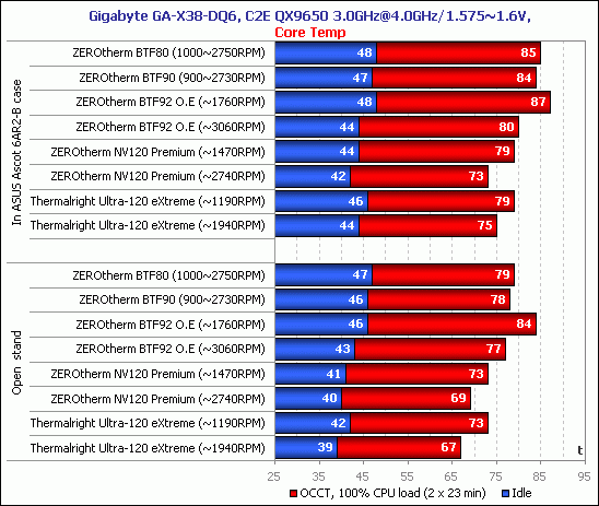 Эффективность систем охлаждения проверялась не менее чем двумя циклами тестирования с периодом стабилизации температуры в корпусе системного блока равным ~20 минутам. На открытом стенде период стабилизации был практически вдвое меньше. За итоговый результат принимались максимальные показатели температуры самого горячего из четырёх ядер процессора по двум циклам тестирования (при условии, если разница между данными не превышала одного градуса, в противном случае тестирование проводилось ещё один раз, как минимум). Несмотря на период стабилизации температуры, как правило, результаты второго цикла прогрева были выше на 0.5-1 градус Цельсия.