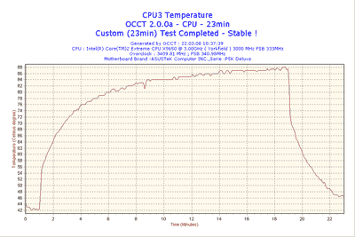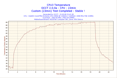 Разогрев CPU был выполнен с помощью программы OCCT (OverClock Checking Tool) версии 1.1.1b в режиме максимальной нагрузки на процессор, при 23-минутном периоде тестирования из которого первая и последние 4 минуты являются временем простоя системы: