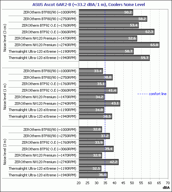 Измерение уровня шума систем охлаждения проводилось электронным шумомером CENTER-321 по хорошо знакомой постоянным посетителям нашего сайта методике. Уровень шума, комфортный по субъективным ощущениям, составляет ~34.5 дБА и отмечен на диаграмме голубой штриховой полосой. Фоновый уровень шума системного блока без процессорного кулера, измеренный с расстояния в 1 метр, не превышал отметку в 33.2 дБА.
