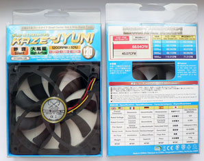 На обороте картонной подложки приведена информация о воздушном потоке вентиляторов и прочие их технические характеристики на 5 языках. В верхней чести упаковки лежит переходник с трёхпинового разъёма на разъём Molex-типа блока питания, а также четыре самореза для крепления вентилятора: