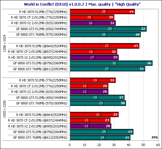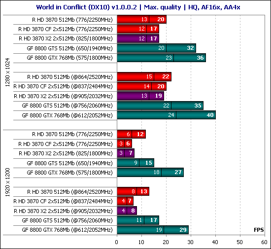 В игре World in Conflict мы можем наблюдать второй провал производительности на CrossFire и Radeon HD 3870 X2 после сцены пещеры в Lost Planet: Extreme Conditions. Проще говоря, CrossFire в данной игре не работает, поэтому в отношении видеокарт на чипах ATI больше добавить здесь нечего.