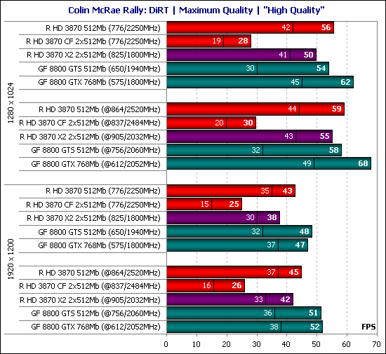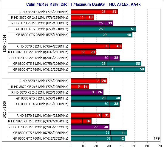Результаты тестирования в очень красивом гоночном симуляторе позволяют сделать вывод, что вторую видеокарту Radeon лучше не добавлять для того, чтобы повысить скорость, а оставить одиночную HD 3870. По-крайней мере, это утверждение справедливо для версии драйверов Catalyst 8.2 и 8.3. Хотелось бы верить, что в следующих версиях драйверов Catalyst или в патчах к игре ситуацию с работой CrossFire в Colin McRae Rally: DIRT исправят.