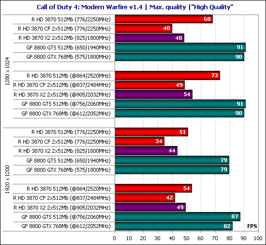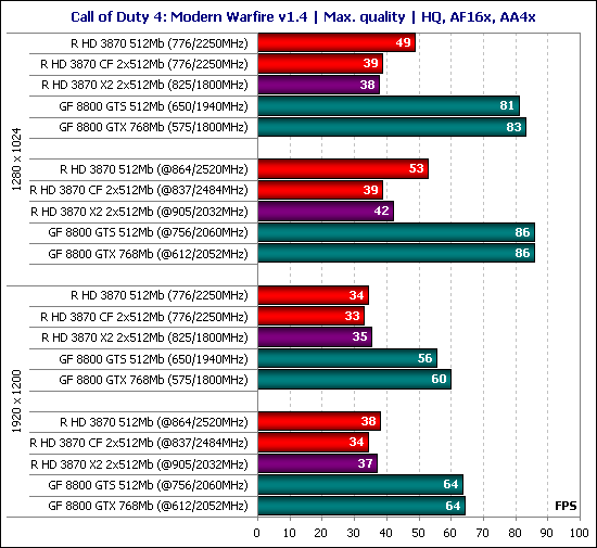 К сожалению, не работает CrossFire и в игре Call of Duty 4: Modern Warfire, в результате чего мы наблюдаем существенный проигрыш видеокарт на чипах ATI двум GeForce. Последние примерно равны между собой даже в высоком разрешении и с методиками улучшения качества, поэтому для фанатов данного шутера выбор очевиден – GeForce 8800 GTS 512 Мб.