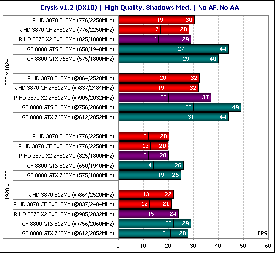 Результаты с полноэкранным сглаживанием и анизотропной фильтрацией в Crysis под DirectX 10 на тестируемых видеокартах никакого интереса не представляют, так как фрейм-рейт и без того слишком низкий.