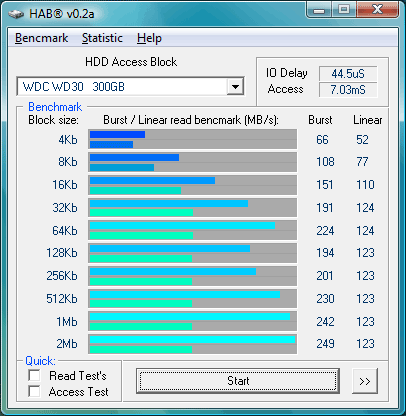 Утилита HAB позволяет установить скорость работы дисков с блоками данных различного размера.