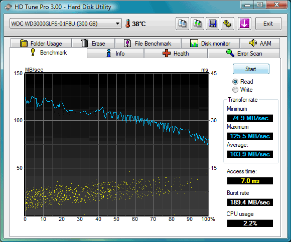 Вот они, феноменальные результаты. Средняя скорость чтения 103.9 Мбайт/сек – это на 40% быстрее, чем мог Raptor предыдущего поколения. Впрочем, в глобальном масштабе это не рекордное значение, существуют SATA диски, способные похвастать примерно такой же линейной скоростью. А вот в чём VelociRaptor оказывается вне конкуренции, так это во времени доступа, составляющем 7 мс. Здесь с новинкой не может сравниться ни один другой SATA диск. Даже старый Raptor показывал в этом тесте время доступа 8.5 мс. Иными словами, Velociraptor представляет собой мощный эволюционный рывок в семействе высокопроизводительных дисков Western Digital.