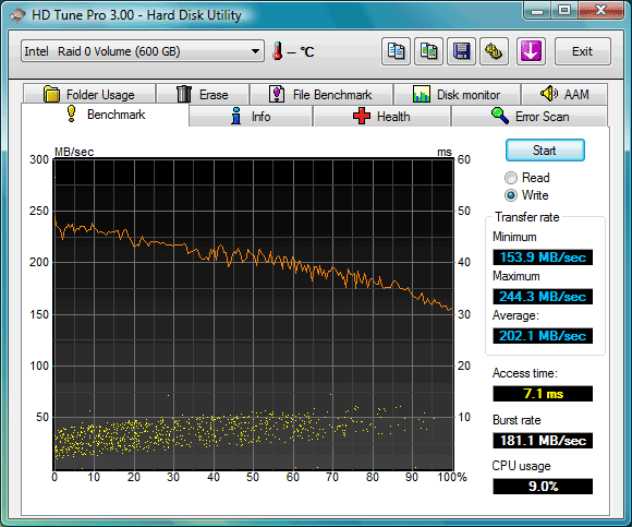 Думается, здесь комментарии излишни. RAID 0, составленный из самых производительных на сегодня SATA дисков откровенно поражает своими скоростными параметрами, демонстрируя среднюю скорость передачи данных в районе 200 Мбайт/сек, сопровождаемую минимальным временем доступа.