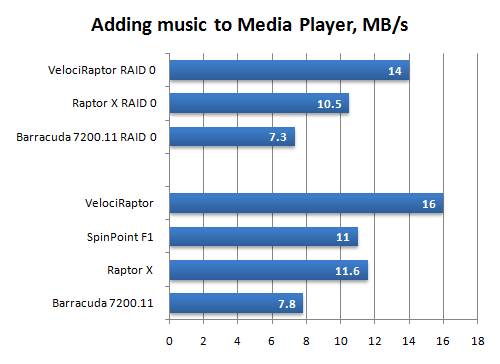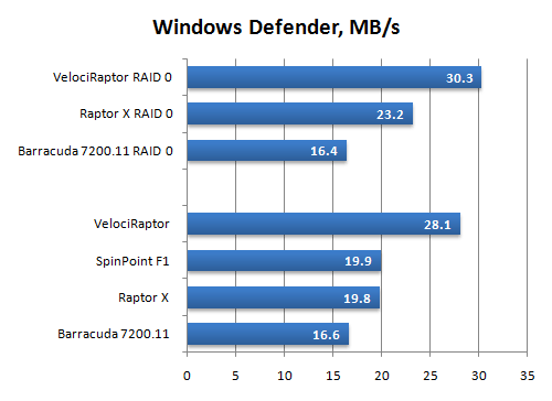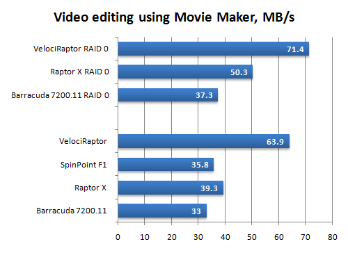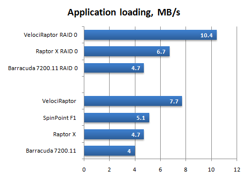 Глядя на диаграмму, можно с чистой совестью говорить о том, что VelociRaptor вполне оправдывает свою цену. Другое дело, следует понимать, что при реальной работе этот диск не даст получить двукратный выигрыш в скорости загрузки и работы приложений, несмотря на полученные результаты. Дело в том, что в данном случае мы приводим «рафинированные» цифры, не учитывающие задержки, накладываемые работой иных компонентов платформы, помимо дисковой подсистемы: процессора и памяти. Однако, очевидно, реальный выигрыш будет тем больше, чем более быстрые комплектующие используются в компьютере.