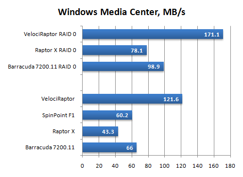 Ничего неожиданного в таблице нет. VelociRaptor демонстрирует полное превосходство над конкурентами как в скорости чтения, так и по времени доступа. Причём, VelociRaptor существенно обгоняет и топовый диск Western Digital предыдущего поколения, Raptor X, что, в общем-то, весьма кстати, так как по скорости чтения он проигрывает последним предложениям Samsung и Seagate.